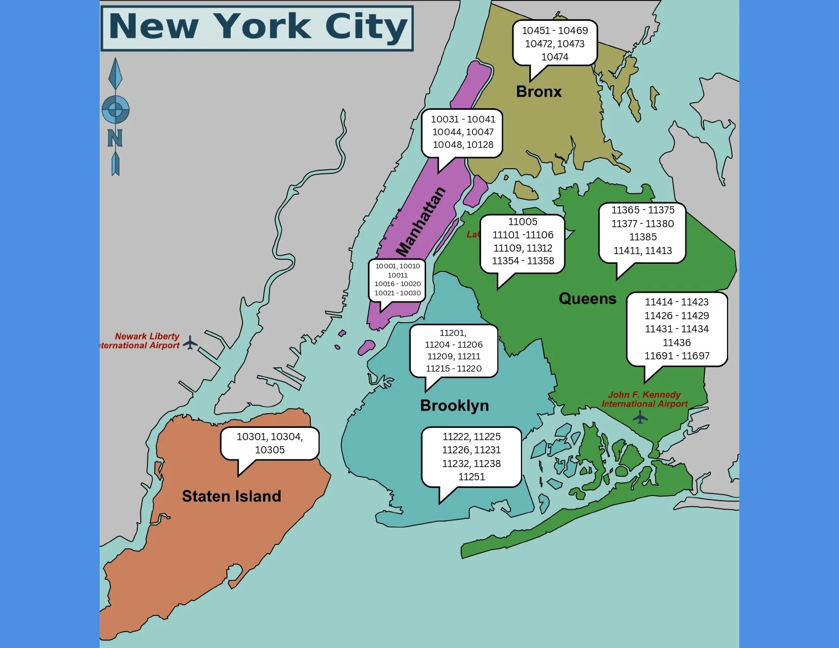 11005, 11101 – 11106, 11109, 11312, 11354 – 11358, 11365 – 11375, 11377 – 11380, 11385, 11411, 11413, 11414 – 11423, 11426 – 11429, 11431 – 11434, 11436, 11691 – 11697